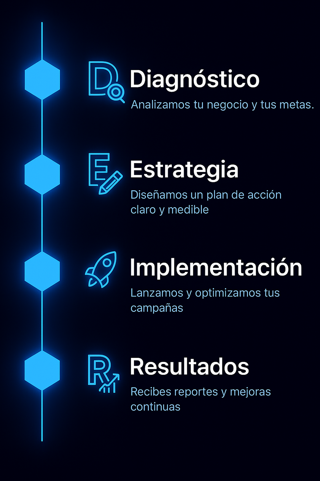 En Quasar Marketing nos enfocamos en entender tu negocio y tus metas para crear estrategias digitales que realmente generen resultados. Nuestro proceso es simple, claro y está diseñado para que cada inversión en publicidad se convierta en crecimiento para tu empresa.